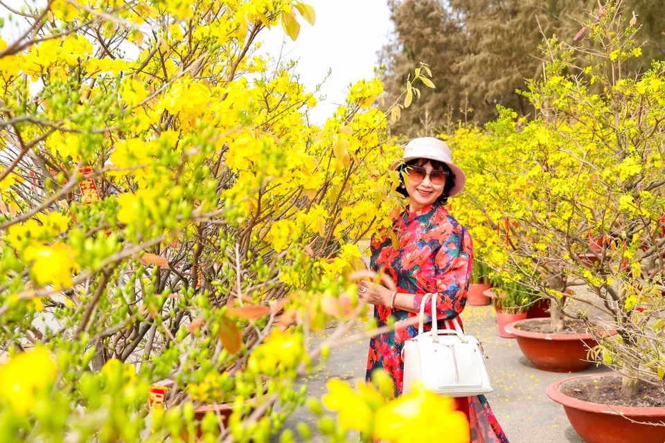 300 gốc mai cùng “cụ mai” phú quý 150 tuổi đang bung nở, tạo thành phông nền rực rỡ cho những tấm ảnh check-in “viral” mạng xã hội của du khách. Anh Hoàng Sơn, Việt kiều Đức mới về nước, chia sẻ: “Lâu lắm rồi gia đình tôi mới có dịp ăn Tết quê. Vì khí hậu lạnh ở Đức không trồng được mai vàng, nên cộng đồng người Việt chủ yếu trưng cây giả vào dịp năm mới. Về tới đây, nhìn thấy hàng trăm gốc mai xếp thành hàng thế này, tôi không khỏi xúc động. Chọn được một điểm du xuân vừa vui vẻ, náo nhiệt, vừa đậm đà bản sắc dân tộc thế này quả là may mắn”.