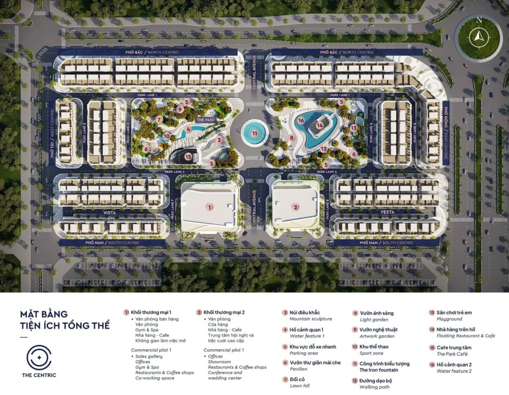 Dự án The Centric được chia làm 4 khu phố chính riêng biệt là Đông, Tây, Nam, Bắc với những nét đặc trưng riêng.