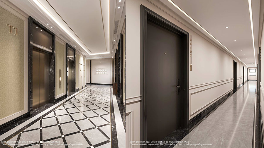 Mặc dù có cấu trúc mặt ngoài vô cùng bề thế nhưng các tòa căn hộ vẫn mang dáng vẻ hòa nhã đầy tinh tế. Điểm nhấn khối đế màu sẫm được phủ lớp sơn giả đá vững chãi, là nền tảng kiên cố, vừa làm nổi bật tổng thể, vừa mang lại cảm giác an tâm và uy nghi cho tòa tháp. Phần mái sảnh được thiết kế cầu kỳ với hoa văn trang trí cổ điển, làm toát lên sự kiêu hãnh và quý phái trong từng góc nhìn.