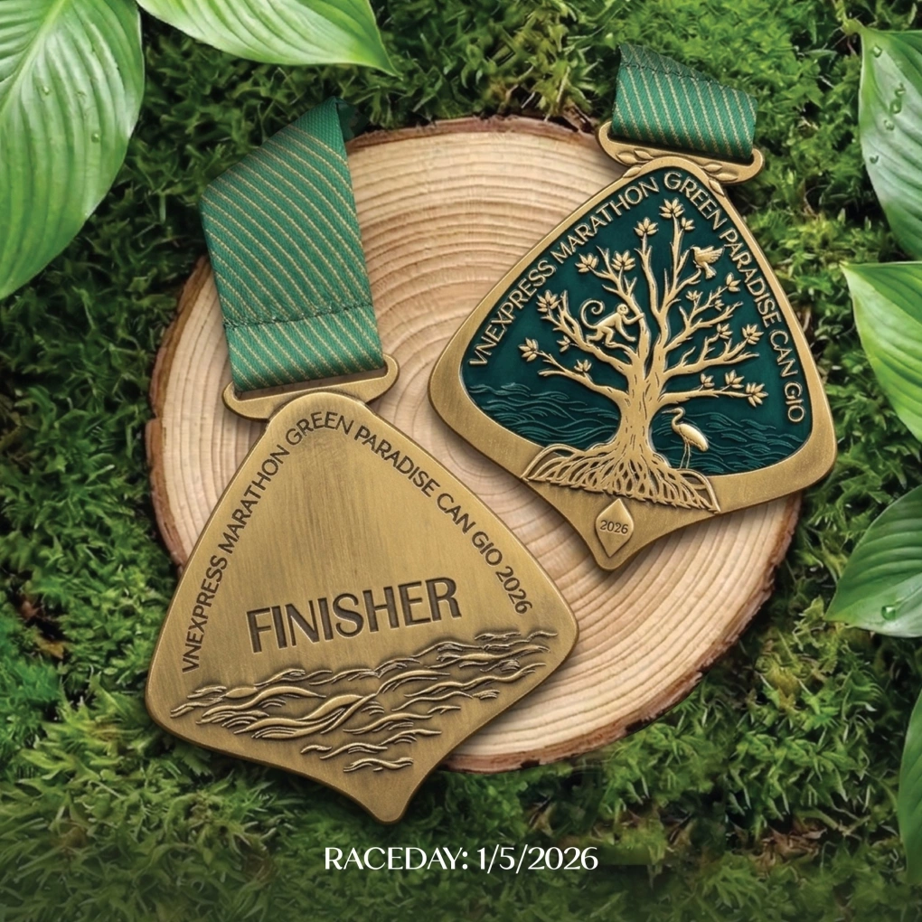 Thiết kế huy chương VnExpress Marathon Green Paradise Cần Giờ 2026 lấy cảm hứng từ hệ sinh thái đặc trưng của địa phương, nổi bật với hình ảnh cây đước và các loài động vật hoang dã.